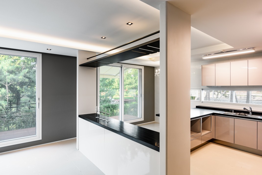 거실과 식당은 벽으로 구획하지 않고 홈바를 두어 적절하게 영역성을 주면서도 개방감있는 공간으로 연출하였다.