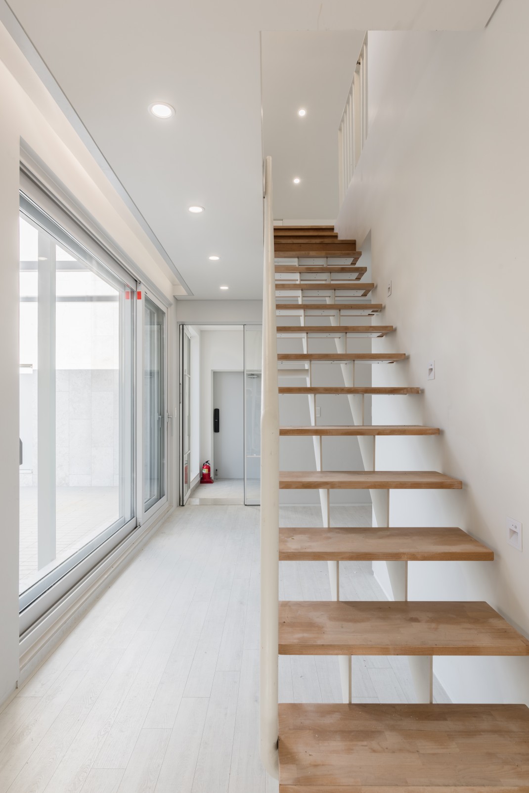 내부는 일관된 톤과 질감으로 정돈된 분위기를 지향한다. 백색과 회백색, 그리고 따뜻한 원목 질감이 교차하는 공간은 작지만 명확한 분위기를 가지며, 단독주택과는 또 다른 도시형 주거의 품격을 보여준다. 계단실은 가볍게 디자인되었고, 슬림한 철제 프레임과 목재 디딤판의 조합으로 시각적 개방성과 수직적 흐름을 동시에 확보하였다. 상부 유닛은 다락과 테라스를 통해 입체적 공간감을 부여하였고, 이를 통해 단위세대의 다양성과 선택성을 확보하였다.