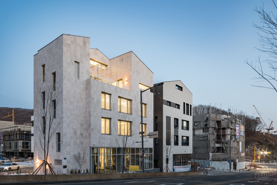 외장재는 밝은 베이지 톤의 석재 패널로 구성되었다. 이는 대장지구 전반의 색채 규제를 반영하면서도, 주변 건축물과 차별화되는 단정한 도시적 외관을 형성한다. 저녁에는 간접 조명으로 인해 벽면에 미묘한 그림자가 드리워지며, 낮과는 전혀 다른 분위기를 자아낸다. 정면의 1층 포치와 진입부는 적절히 후퇴되어 공공성과 환대의 감각을 강화한다.